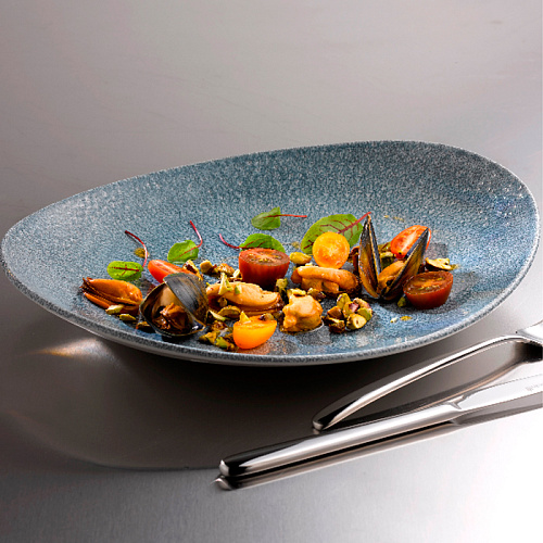 Вы можете дешево купить крупным и мелким оптом _Блюдо овальное 31,7x25,5см, цв. Raku Topaz Blue «Studio Prints» Churchill (кр12) фарфор (артикул RKTBOP121) от производителя Churchill