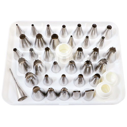 Набор состоит из 36 различных насадок из нержавеющей стали для мешочков и 3 адаптеров, все в практичной пластиковой коробке для транспортировки. Насадки разных размеров.