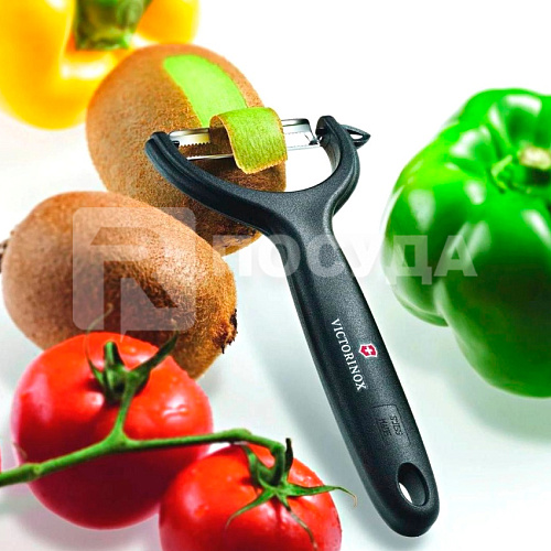Вы можете дешево купить крупным и мелким оптом Овощечистка с плавающим поперечным лезвием 14см черная ручка Victorinox (артикул 7.6079) от производителя Victorinox