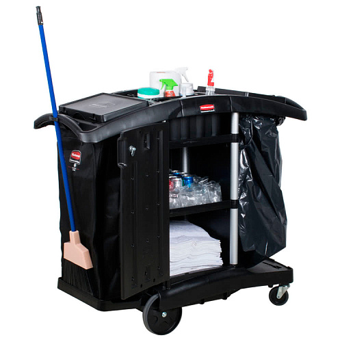 Вы можете дешево купить крупным и мелким оптом Тележка 131,4x55,8 см, H=111,8 см, для гостиниц складная на 10-12 номеров, цв.черный, Rubbermaid (артикул FG9T7600BLA) от производителя Rubbermaid